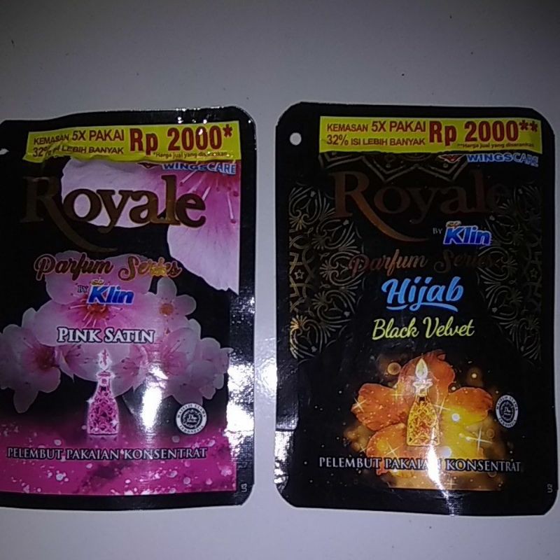 Pelembut dan pewangi pakaian.Merk : RoyaleNetto : 58mlKemasan : pouchHarga : 1pouchWangi : - hijab black velvet - pink