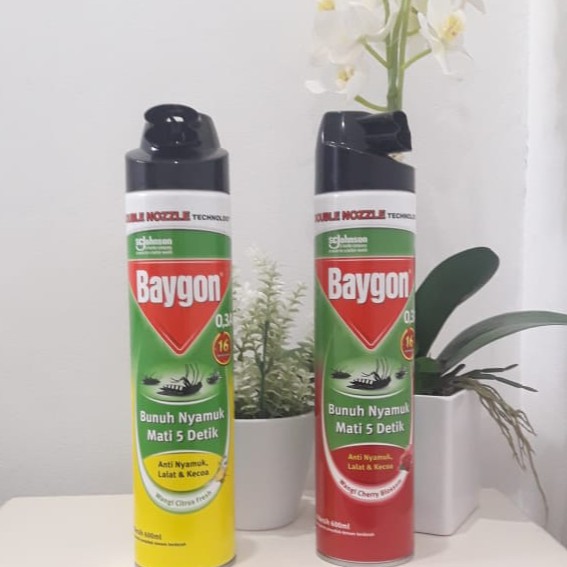 Baygon Aerosol Citrus Fresh 600 ml - Anti Nyamuk, Lalat dan Kecoa. Bunuh Nyamuk, Mati dalam 5 detikPestisida rumah tangga racun kontak dan pernafasan berbentuk aerosol berwarna jernih kekuningan, untuk melumpuhkan dengan cepat dan terbukti efektif membunuh nyamuk Aedes aegypti, Culex quinquefasciatus, lalat Musca domestica, Kecoa, dan semut didalam ruangan.Keunggulan:* Bunuh Nyamuk mati dalam 5 detikdengan semprotan langsung dan wangi Citrus Fresh* Perlindungan 16 jam dari nyamuk penyebab demam berdarah* Formula lebih cepat dari Baygon untuk bunuh nyamuk bahkan untuk nyamuk tersembunyi* Dengan double noozle, lebih efektif menyebar keseluruh ruangan Note:Tambahkan kardus dan bubble wrap untuk keamanan pada saat proses pengiriman.Seller tdk bertanggung jawab atas paket yg tidak dilapisi kardus dan bubble wrap.Berikut link bubble wrap: https://shopee.co.id/product/186873618/357883