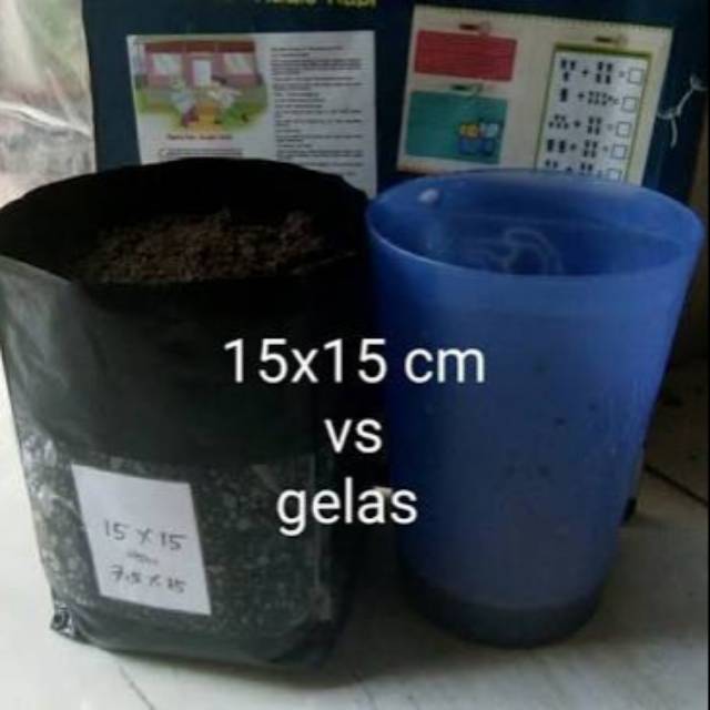 Polibag untuk menanam ukuran 15x15 cm Sebesar gelas minum biasa. Setelah diisi media tanam maka d = 8 cm, t = 11 cm dan v = 0.6 liter. Ukuran ini cocok untuk penyemaian benih sampai umur 30-40 hari atau sampai siap pindah , harga paling murah karena langsung dari a