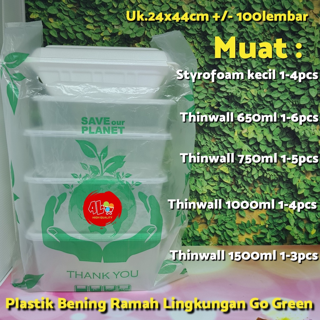 Kantong plastik TRANSPARAN ramah lingkunganMerk : DELMANUkuran dan ketebalan :15 (15x29cm) 15 micron = +/- 171 pcs24 (24x44cm) 17 micron = +/- 100 pcs29 (29x50cm) 20 micron = +/- 61 pcs35 (35x59) 25 micron = +/- 36 pcs - Uk 24 bisa utk styrofoam kecil/bubur/sekat, thinwall kotak uk 650/750/1000/1500ml - Uk 29 bisa utk kotak bento, nasi kotak uk 18x18/20x20/22x22Warna : Transparan / Bening dan bermotif GO GREENIsi : 500gr per bungkus (semua ukuran)1kg dapat 2 bungkus.KELEBIHAN :- Terurai dalam 5 tahun (tergantung kondisi alam)Sampah kantong plastik konvensional membutuhkan waktu hingga 500 tahun baru terurai.- 4R : REDUCE - REUSE - RECYCLE - RETURN TO EARTH- Hancur (fragmentasi), terurai (degradasi) terjadi pada saat bersamaan.Fungsi :- Kantong utk styrofoam, thinwall kotak, nasi box- Kantong sampah rumah tangga- Kantong belanja- Kantong cucian laundry- Kantong pembuangan kotoran hewan/Celemek sekali pakai- Kantong makanan take away- dll.Kantong plastik delman ramah lingkungan ada 2 jenis yang kami jual :- Putih Susu ukuran 15,17,24,29,35,40- Tranparan ukuran 15,24,29,35 (lebih tebal dan tdk gampang ro