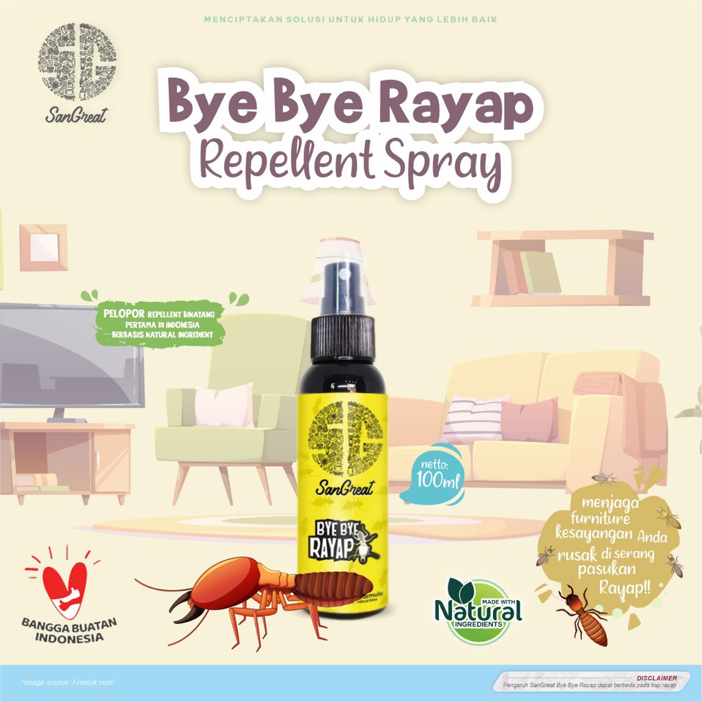 SanGreat Bye Bye Rayap anti rayap pengusir rayap spray 100 ml----------------------------------------------------------------------------------------------Rumah Hancur Karena Rayap?Furniture Habis dimakan Rayap?Kitchen Set juga Rusak?Plafon Sampai Jebol karena rayap?“Rayap adalah golongan hama serangga yang dapat memakan zat selulosa pada kayu, kardus, kertas, kain wol, bahkan gypsum. Ada 3 jenis rayap yang populer di Indonesia, yaitu rayap tanah, rayap kayu kering, dan rayap kayu lembab. Sifat rayap bukan hanya pengganggu saja, namun merusak. Sehingga jika dibiarkan begitu saja, kerugian yang anda dapat akan semakin besar karena semakin banyaknya furniture yang rusak”SANGREAT BYE BYE RAYAPDiformulasikan untuk mengusir rayap dan mencegah rayap bersarang di rumah Anda tanpa racun. Sehingga aman untuk keluarga.Dengan pemakaian yang tepat dan rutin, akan memberikan efek trauma pada rayap sehingga rayap akan menjauh dari tempat yang diberi Bye Bye Rayap. Bye Bye Rayap dapat digunakan untuk rayap tanah, rayap kayu kering maupun rayap lembab. Cara Pakai:Kocok dahulu sebelum digunakan kemudian semprotkan Bye Bye Rayap ke tempat yang diperlukan secukupnyaSemprot kembali jika wangi telah menguap dan tidak tercium lagi. Aplikasikan secara rutin untuk menapatkan hasil yang baik.Peringatan:Jauhkan dari jangkauan anak-anakBilas dengan air jika mata terkena Bye Bye KecoaKomposisi:Blended Essensial Oil#Byebyerayap#antirayap#pengusirrayap#obatrayap#pestcontrolra